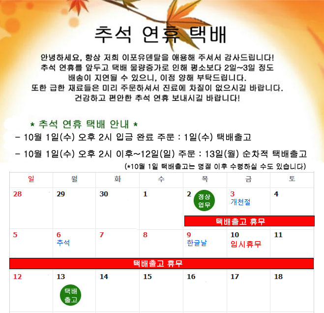 ¾È³çÇϼ¼¿ä! Ãß¼®¿¬ÈÞÅùèÀÏÁ¤ÀÔ´Ï´Ù. 10¿ù10ÀÏ ÀÓ½ÃÈÞ¹«ÀÔ´Ï´Ù. ¾çÇØ ºÎʵ右´Ï´Ù!